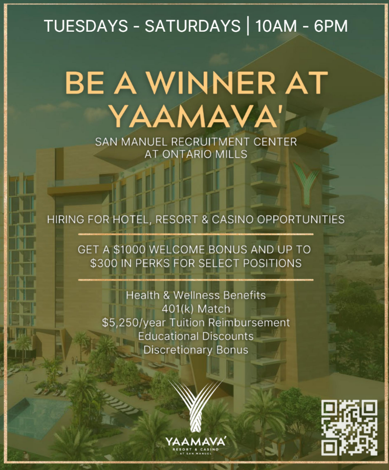 A selection of print ads for Yaamava' Resort and Casino, focusing on their recruitment efforts & reward programs.